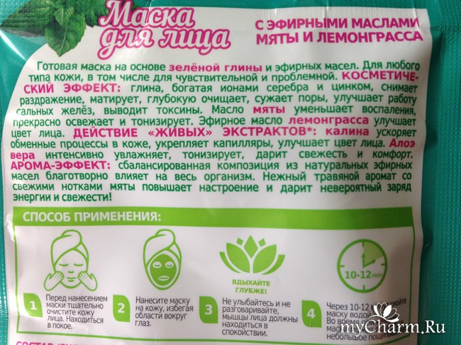 На обратной стороне упаковки краткое описание действия маски, активные компоненты, инструкция и состав.