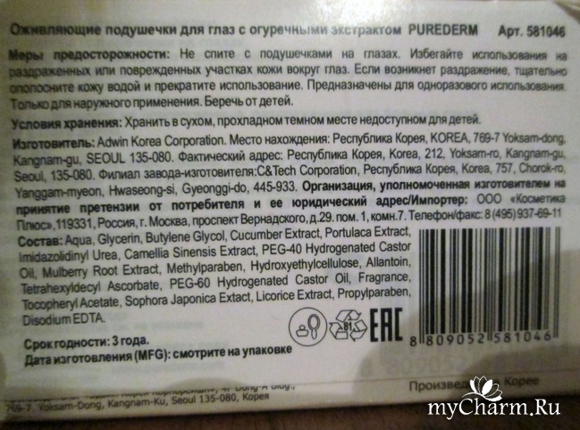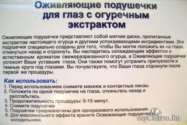 Рекомендую подушечки с огуречным экстрактом всем тем, кто любит бережную заботу о коже и спа-релакс. С ними вы всегда будете выглядеть замечательно, а ваши глаза не выдадут ночные бдения за компьютером на сайте MyCharm.ru… и не только.