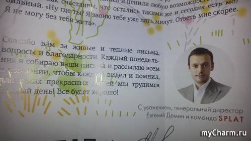 Была очень удивлена, когда вместо информационного листка из открытой коробки выпало самое настоящее письмо, подписанное генеральным директором SPLAT Евгением Деминым.