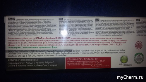 Основные три компонента пасты SPLAT «Биокальций» описаны на бумажной упаковке: 1) сочетание гидроксиапатита с Кальцисом, полученным из яичной скорлупы (они отвечают за реминерализацию эмали),