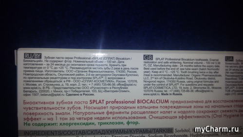 Коробочка средства довольно массивная – на порядок шире того же Лакалюта. Палитра зависит от типа средства и его предназначения. SPLAT «Биокальций» имеет упаковку бело-голубую с серебристыми и красными (логотип) оттенками. Помимо названия, штрих-кода, состава и общей информации о продукте на 12! языках на ней можно прочитать полезные нюансы о компонентах, результатах клинических испытаний и особенностях производства.