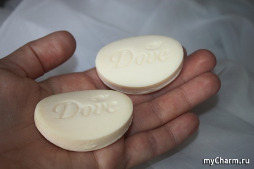 Некоторое время назад я приобрела подарочную упаковку мыла, включающую несколько обычных кусочков мыл и шесть тестовых коробочек с миниатюрными кусочками. Такие мини-варианты оказались очень милыми и удобными. Хочешь- бери с собой в отпуск, да и дома он хорошо приживется в мыльнице. Кстати, мыло Dove при попадании лишней воды тоже раскисает, но не становится соплевидной жижицей, а может просто размягчиться. Пусть это не стопроцентный аргумент, но пользоваться им еще вполне возможно.