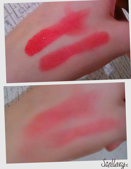 На нижнем фото: пыталась оттереть без каких-либо дополнительных средств. Мне это не удалось. Это говорит о том, что помада достаточно стойкая. Во время "носки" цвет частично съедается, но основной пигмент все же остается.