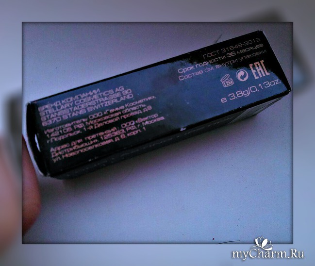 В картонной упаковке находится помада в черном тюбике с надписью золотистыми буквами.