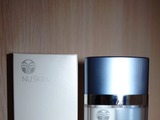 Создатели бренда Ню Скин очень постарались и явили свету эстетическое совершенство. Да, такой флакон приятно держать в руках, на него хочется любоваться и даже демонстрировать. В едином пространстве за полупрозрачными матовыми стенками ровно расположились две удлиненные капсулы – белая и серо-голубая. Они вовсе не скрываются от наших глаз, потому что в этом и есть главная интрига средства. В каждой капсуле формула уникального состава, и только вместе они – союз и завершенный продукт для сохранения молодости и красоты. По крышкой располагается специальный дозатор с двумя отверстиями. Это удобно и понятно. От степени нажима зависит объем подачи средства.