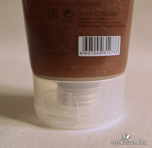 На обратной стороне тубы много информации. Но, как случается частенько, от шрифта можно "сломать глаза". Самое читабельное - это штрих-код (произведен скраб в России), объем и ГОСТ.