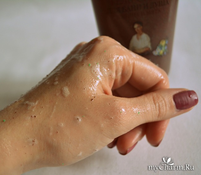 Без применения губки пены образуется не много. Если не использовать мочалку, а просто наносить и массажными движениями и растирать гель-скраб по телу, то тогда гранулы чувствуются. Есть легкий скрабирующий эффект. Можно сравнить с легким пилингом.