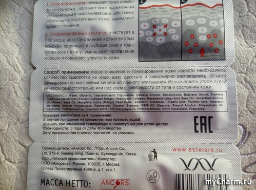 На обороте упаковки приведены данные о воздействии сыворотки на кожу, при этом даже изображен процесс воздействия каждого вида коллагена, входящего в состав средства. Наглядное изображение мною всегда воспринимается проще и понятнее, чем простое описание, поэтому для понимания действия средства такие картинки очень помогают.