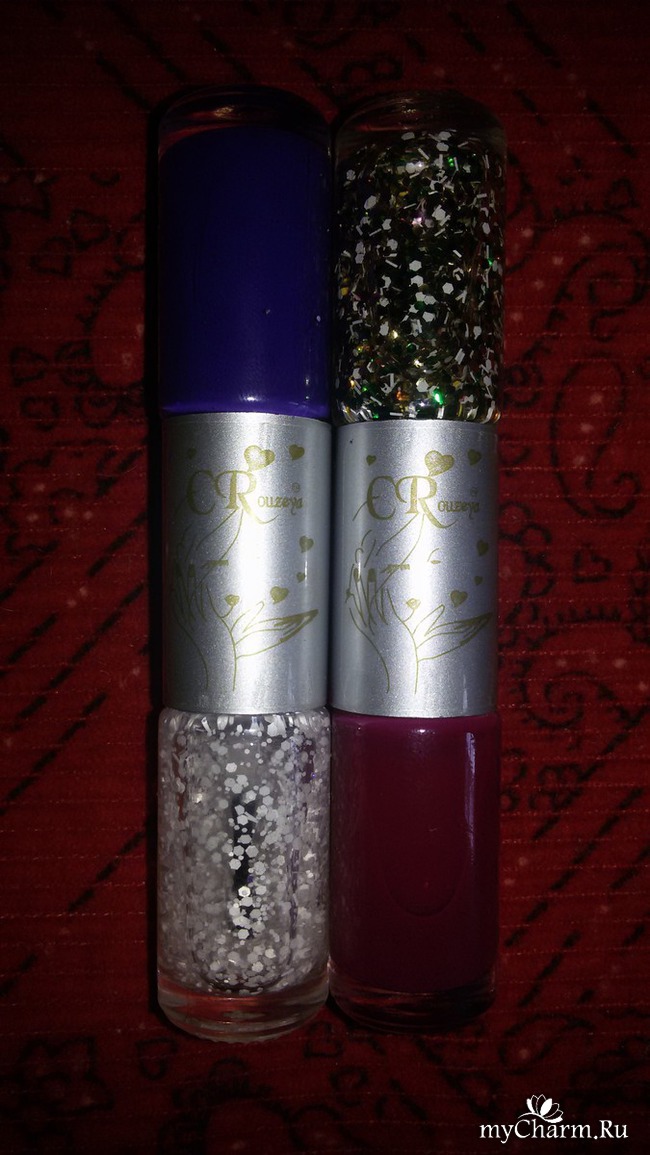 Но на необычные оттенки лака иногда поглядывала. И вдруг обнаружила его – лак с двусторонней емкостью. Обычно в таких тюбиках выпускают помаду или тушь. Лак встретился мне впервые. Ну как не попробовать? В магазинчике двойные лаки включали в себя, в основном, матовый цвет и контрастные блестки. Я выбрала две пары оттенков: винный с золотисто-зелеными блестками и фиолетовый с белыми. Оба стоили по 40 рублей.