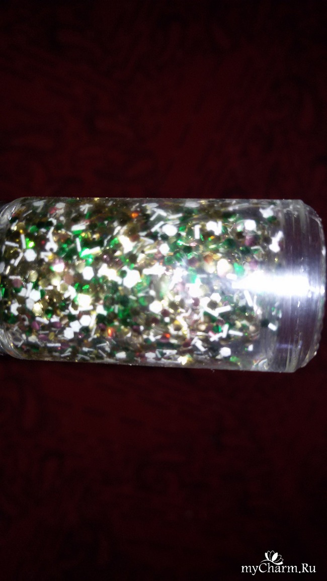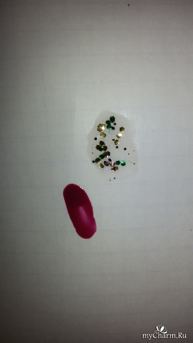 На дне флакончиков значатся цифры, обозначающие порядковый номер оттенков: на бордовом - №6, на золотисто-зеленом - № 8, на фиолетовом - №1, на белых блестках - №9.