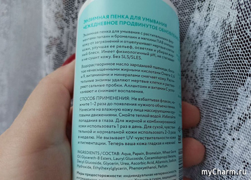 Вот и ко мне моя пенка приехала без каких-либо дополнительных коробочек. Просто флакон. Вся информация о продукте и способе применения – на нём. В составе пенки - мочевина, энзимы, глицерин, аллантоин, папаин. Средство не содержит искусственных красителей, сульфатов. Тем, у кого жирная и комбинированная кожа, рекомендуется использовать пенку 1 раз в день, у кого сухая и чувствительная - 2-3 в неделю. В частности, мне можно каждый день.