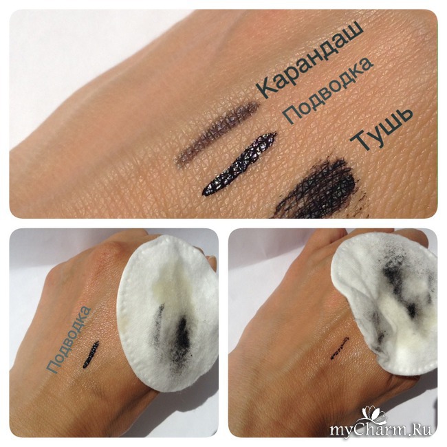 Что же мы видим? Все, кроме подводки удалилось без следа, даже повторное трение не смогло полностью удалить ее. Обычная подводка, смывается водой. Скорее просто маслу не поддается.