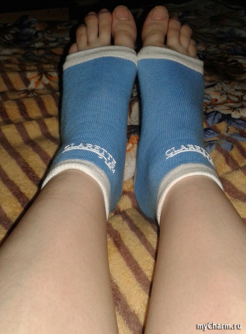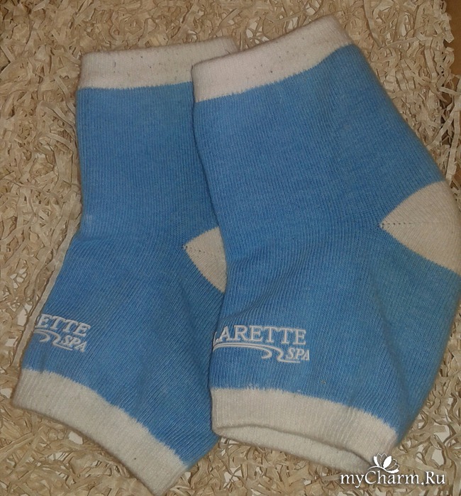 Напяточники от Clarett симпатичного голубого цвета, непосредственно по краям и область пяток белого цвета. На ощупь они достаточно мягкие, поверхность у напяточников внутри гелевая. Ткань на 85 % состоит из хлопка, на 14 % из спандекса и на 1 % из полиэстера. На самом деле увлажняющий эффект достигается благодаря внутренней гелевой поверхности напяточников, которая в свою очередь состоит из таких компонентов как: