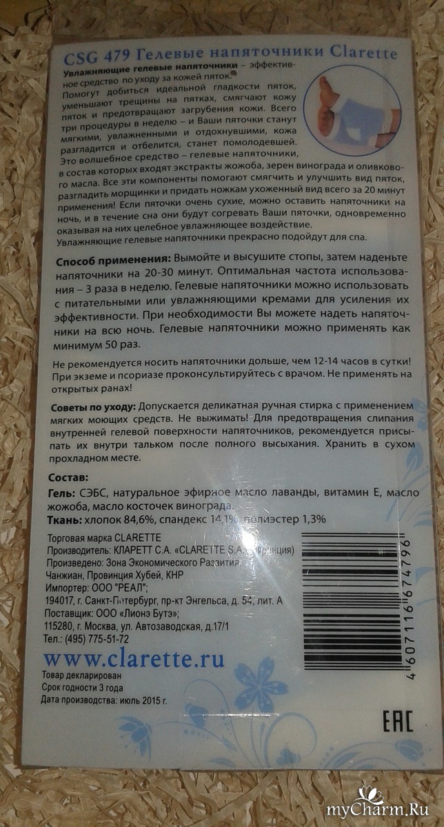 Поэтому переворачиваем пластик, и читаем описание, состав, способ применения. Здесь же указаны советы по уходу за напяточниками, а также информация о производителе и срок годности. Производитель, как уже было сказано выше - французский бренд Clarett, срок годности 3 года с даты изготовления (июль 2015), то есть до 2018 года.