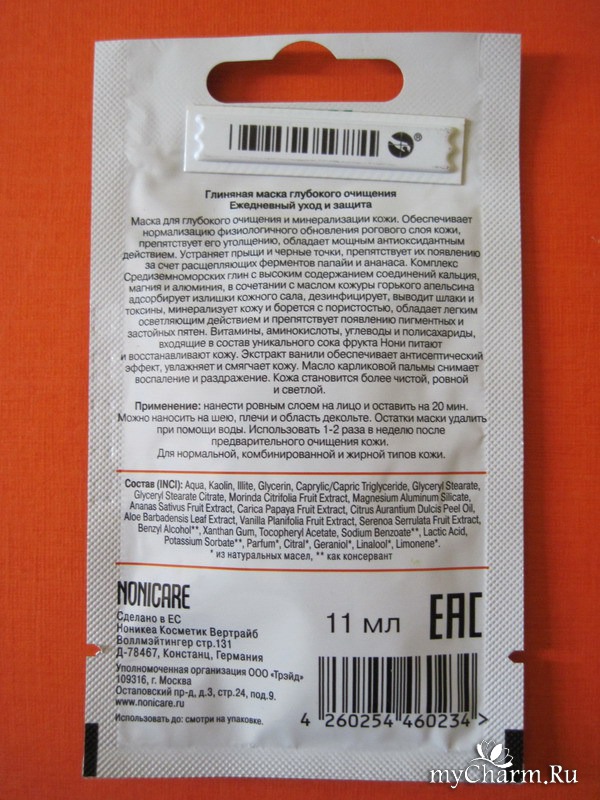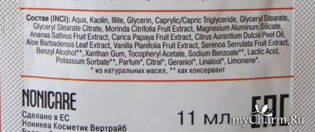 Конечно, можно было купить просто пакетик с белой глиной. Но маска Nonicare – это не просто глина, это еще семь полезных экстрактов растений, оказывающих на кожу полезное воздействие (очищающее, увлажняющее, омолаживающее, восстанавливающее) – нони, ананаса, папайи, алоэ вера, горького апельсина, ванили и карликовой пальмы. Также в составе маски есть витамин Е, глицерин и молочная кислота.