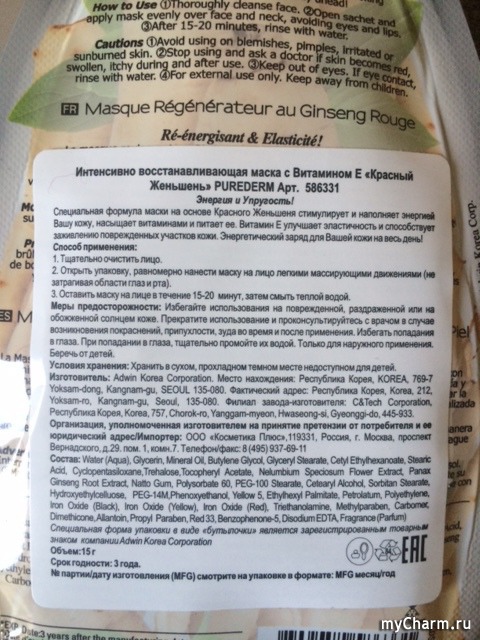 Еще пару лет назад лично я слыхом не слыхивала о южнокорейской косметике и уж точно не пополнила бы ею свой запас уходовых средств. Сегодня же надпись «made in KOREA» - знак качества, а уж если это PUREDERM… Их стильные упаковки, удобные дозировки и натуральный состав действуют на меня гипнотически. Натурально, отпускает только дома, когда разглядываю покупки. А что самое приятное, продукты марки никогда не разочаровывают. Интенсивно восстанавливающая маска с витамином Е «Красный женьшень» - не исключение.