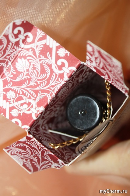 Крышка коробочки дополнительно закреплена наклейкой, а значит можно быть уверенной, что никто до вас не заглядывал сюда. Внутри оформление картона не менее привлекательное. На бордовом фоне расположился растительный орнамент, словно это изысканная ткань. Также имеется вставка-держатель, которая не позволяет флакону со средством болтаться и плотно фиксирует его положение.