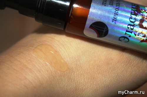 Важно перед применением хорошо очистить кожу. Затем встряхиваем флакон, выдавливаем Эластин и наносим его, следуя массажным линиям. Смывать не нужно. Он довольно быстро впитывается, отчего кожа выглядит с едва заметным глянцем. Она становится невероятно гладкой и подтянутой. То, что средство подтягивает, заметно и визуально. Эффект немного похож на маску-пленку, вот только снимать ничего не нужно. Ничего подобного у меня еще не было. При этом также ощущается увлажнение и отсутствует жирный блеск. По поводу области глаз ничего не сказано, но я по привычке её обходила… а может и зря.