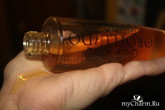 Элексир желтого цвета, достаточно насыщенного и глубокого. Т. е. никаких негативных ассоциаций не возникает) А ведь название OROFLUIDO как раз переводится с испанского как «жидкое золото». Когда открываешь крышку флакона, то вдыхаешь пряный сладковато-ванильный аромат. Возможно кому-то он покажется терпким, а я назвала бы его богатым. Только на волосах он ощущается достаточно короткое время.