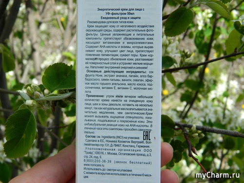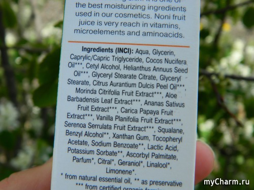 Что же делает её такой? О, в составе чего только нет! Волшебный сок фрукта нони, о котором уже столько писалось в обзорах, экстракты алоэ, ванили, папайи, карликовой пальмы и ананаса, масло кожуры апельсина, подсолнечника и кокоса. Самый настоящий витаминный коктейль! Плюс витамины добавлены дополнительно. Немудрено, что крем готов делиться энергией! Представляете, какой витаминный заряд получает кожа после того, как он впитается?