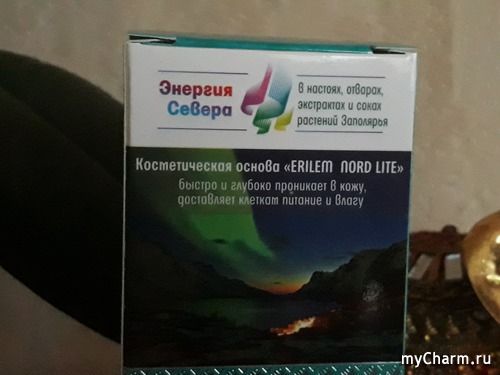 Косметическая основа «ERILEM NORD LITE»: ледяная вода, гель из листьев водяного кресса, фосфолипиды соевые, масло шиповника, эмолент цетиол, сок ревеня тангутского, аминокислотный коктейль, масло семени льна, гиалуроновая вода, косметический фитоальянс «Северный сбор»: лофант анисовый, аралия манчжурская, сок морошки, эдельвейс камчатский, гусиный лук, арктический подснежник, культуральная питательная среда, релаксирующий фитоконцентрат, целебный пакет «Сияние Севера»: настой иван-чая, хвоя красной ели, сок брусники, масло можжевельника, ягоды вороники (шикши черной), отвар шиповника, аллантоин, ароматическая композиция, цитрат серебра.