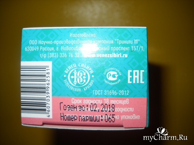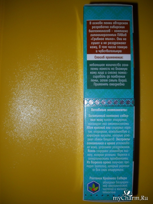 Сбоку на коробочке производитель уверяет нас в том, что в данном средстве на 100% сохранены все активные вещества. Здесь же имеется и более подробная информация о составе: помимо трех перечисленных выше комплексов, чудодейственный гель-пенка включает в себя витаминный комплекс лучших северных ягод (в частности, вороники и клюквы с заманихой) и еще целый ряд не менее ценных ингредиентов. И ни единого вредного компонента в составе!