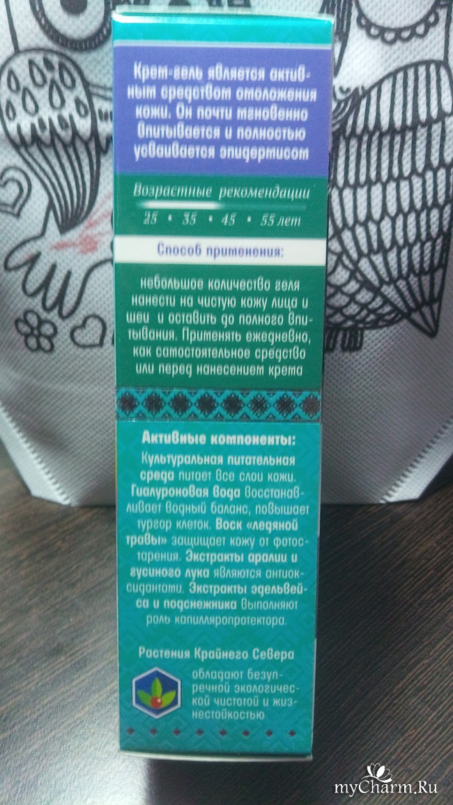 Внешний вид продукта, обещания производителя. Обожаю разноцветный оригинальный дизайн «Венца Сибири»! Для меня холодной зимой это просто поднятие настроения уже с помощью цветотерапии. Крем-гель также, как и все остальные средства, заключен в картонную коробочку, на которой по бокам приведена вся возможная информация о составляющих продукта, подробно по каждому компоненту (чем полезен, каково его действие в креме и т. д.). На самой тубе с кремом информация частично дублируется, но, естественно, не полностью.