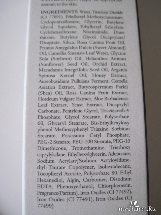 - экстракты: камелии китайской, орхидеи, центеллы азиатской, меда, плодов дикой розы, ячменя, алое вера;