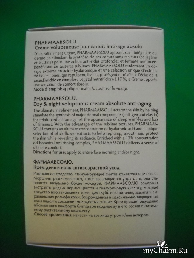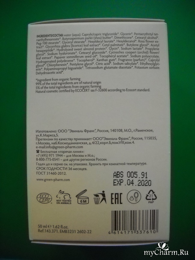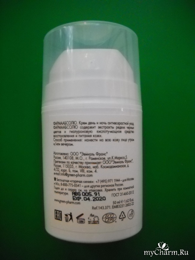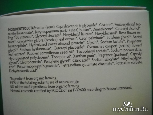Что касается состава, то он весьма приятен: я обнаружила в нем такие ценные компоненты, как гиалуроновая кислота, экстракт розы, масло ши, экстракты редких черных цветов, а также экстракт орхидеи. Более того, косметические средства от Green Pharma являются счастливыми обладателями сертификата ECOCERT! А еще эта косметика не тестируется на животных – зверушек я люблю, поэтому данная новость очень меня порадовала.