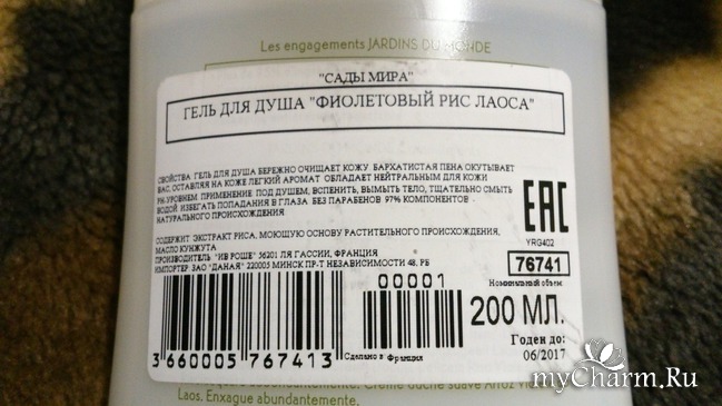 Аромат и консистенция. Первое, на что обращаешь внимание еще в магазине – его аромат. Он довольно специфичен, на любителя. Но я как раз являюсь таким любителем)) Запах крем-геля очень необычный и совсем не похож на другие, вообще никогда не встречала подобных – поэтому попробовать его стоит хотя бы из чистого интереса. Аромат очень природный, натуральный и несладкий, что мне понравилось. Не знаю, как пахнет фиолетовый рис Лаоса – но аромат во флакончике мне запомнился.