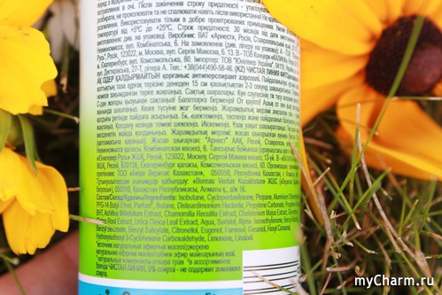 Состав средства указан довольно мелкими буквами и как я не пыталась его получше сфотографировать, так и не получилось хорошо сфокусироваться. В нем и правда нет спирта и парабенов и есть экстракты ромашки, тысячелистника, чистотела, экстракт корня солодки и листьев крапивы. Наверное, это и есть тот самый отвар пяти трав, но экстракта жасмина в составе я не нашла.