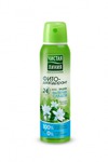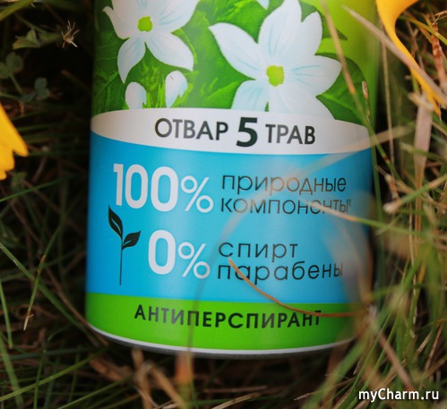 Антиперспирант в форме спрея, объем 150 мл. На лицевой стороне указано, что он не содержит спирта и парабенов, в составе находятся 100% природные компоненты и сделан на отваре пяти трав. А еще он защищает от белых следов 24 часа в сутки.