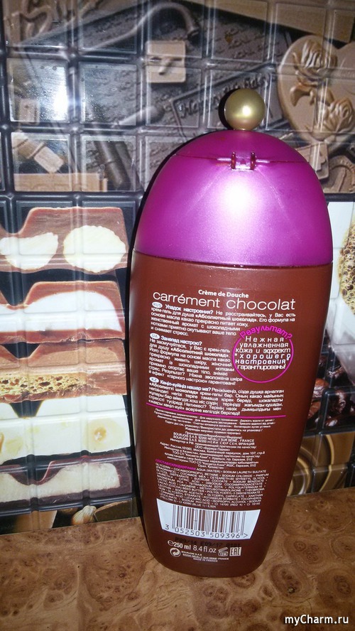 Во время мытья меня сопровождал приятный шоколадный шлейф, который на коже раскрывается мягче и нежнее, оставаясь там еще несколько часов после принятия душа. Это действительно не может не поднять настроение, как обещают сами производители. Чувствовалась, что кожа после геля у меня неплохо увлажнена, и даже намека на сухость я не заметила.