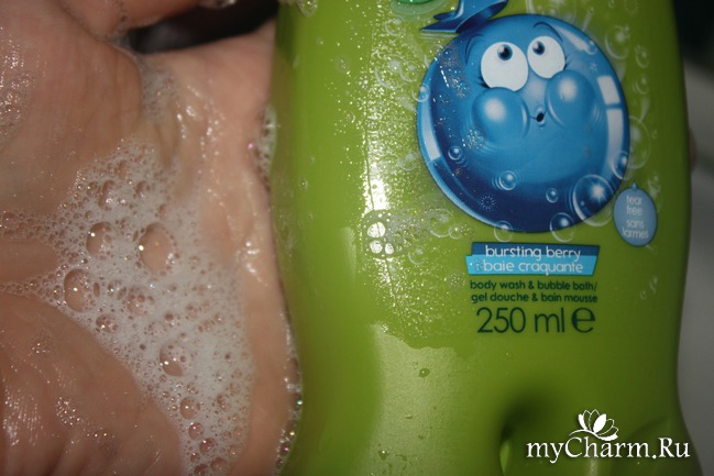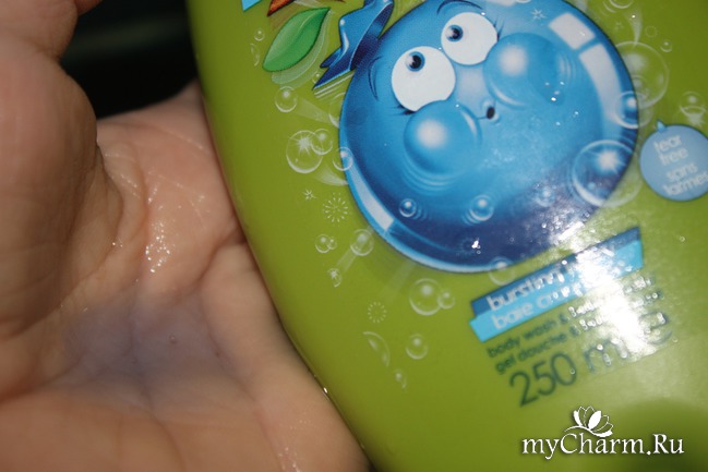 Гель для душа «Ягодный взрыв» исполнен в зеленом яблочном цвете с желтым колпачком. На лицевой этикетке изображена пухлая ягодка (видимо черника или голубика) в окружении мыльных пузырьков вот-вот готовая взорваться, потому и рожица у нее смешная. Средство сине-голубого цвета, прозрачное. В меру густое и в качестве геля для душа используется вполне экономно. А вот пеной для ванны я его назвать не могу, ведь для этого необходима высокая степень пенообразования. В данной случае мыльность умеренная. А это то, что надо для детского геля! Еще очень радует аромат. Это сладко-ягодное сочетание, очень напоминает что-то кондитерское или жевательную резинку. По крайней мере, мои детки это так описали.