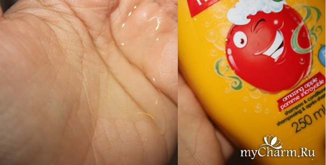 Шампунь-кондиционер «Яблочное веселье» это солнечно-желтый флакон с оранжевой крышкой. На лицевой этикетке вам так нагленько подмигивает сочное красное яблоко с пышным пенным чубом в окружении танцующих мыльных пузырей. Шампунь достаточно густой, поэтому обязательно сначала размыльте его в ладонях, прежде чем наносить на волосы ребенка. На вид средство прозрачное с едва уловимым зеленоватым оттенком. А какой аромат! Это яблочная свежесть! Никуда нельзя деться - хочется в него окунуться и вдыхать без остановки)) Шампунь-кондиционер славно справляется со своей работой. Хорошо мылится, смывается загрязнения. После его использования волосы моей дочки чистые, блестящие и хорошо расчесываются. Пару раз пробовала использовать на себе. Ароматненько и приятненько.