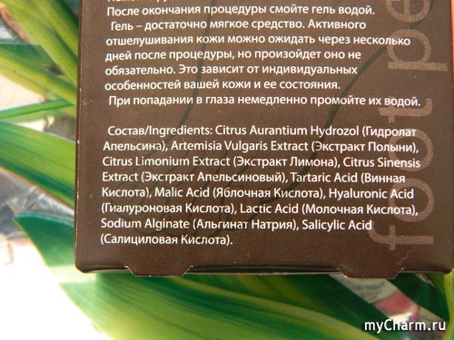 Глядя на компоненты, входящие в состав средства, понимаешь, почему действие геля-пилинга столь мягкое. Дело в том, что все кислоты (винная, яблочная и молочная) располагаются ближе к окончанию списка. С одной стороны, это хорошо – средство не агрессивно по отношению к коже, с другой – количество активных компонентов слишком мало, чтобы растворить ороговевший слой кожи. Именно по этой причине огрубевшая кожа ничуть не видоизменилась.
