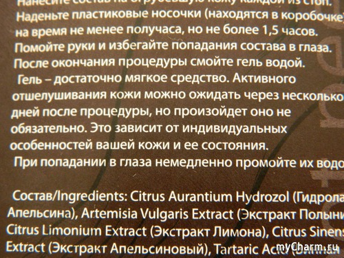 Гель-пилинг – это прозрачное вязкое (гелеобразное) вещество с приятным нежным ароматом фруктов. По коже он распределяется прекрасно. Производитель не пишет, что для нанесения нужны перчатки (чтобы кожа рук избежала контакта с гелем), выходит, можно наносить руками. Единственное – необходимо их хорошенько помыть после того, как на ноги будут надеты бахилы.