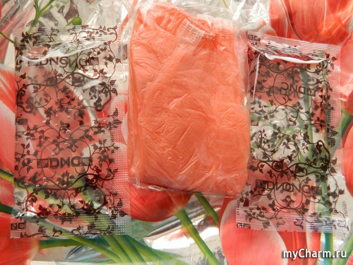 Вот такой картонный пакетик с нарисованной пяточкой. Внутри него скрываются «пластиковые носочки», больше известные нам как бахилы, и два пакетика со средством – по 20 миллилитров каждый.
