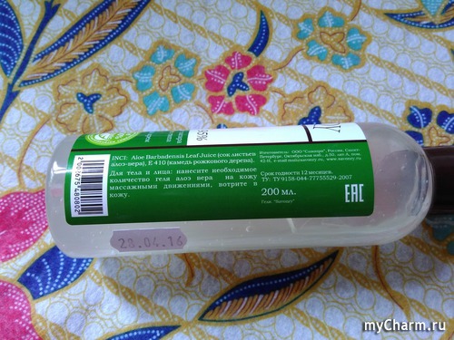 Сбоку флакона приведен состав геля: в нем всего два компонента! Сок листьев алоэ вера и камедь рожкового дерева. Второй компонент применяется в качестве консерванта (совершенно безопасного для кожи), благодаря которому сок алоэ не теряет своих свойств в течение целых 12 месяцев! Здесь же сбоку имеется наклейка с датой изготовления данного средства. Мне достался самый свежий продукт, вот что значит забота о потребителе!