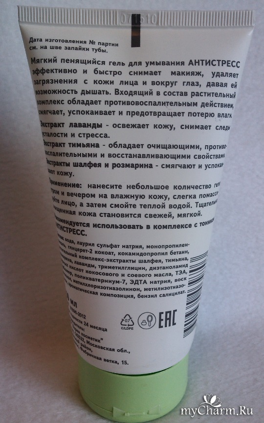 Повертев упаковку в руках, нашла информацию, что этот гель не содержит мыла, а значит, не будет щипать глазки. Способствует очищению кожи и увлажняет ее. В составе имеются растительные ингредиенты и витамины. Ну как было не купить такое многообещающее средство. Тем более, консультант в магазине сказала, что очень хорошо берут эту серию продуктов и они всегда заказывают ее в большом количестве. Цена была невысока, поэтому на покупку меня не пришлось уговаривать.