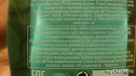 В большинстве своем компоненты не радуют – но ведь Avon и не утверждает, что марка – натуральная и органическая. Начнем с хорошего. Из хорошего – экстракты плодов грейпфрута, кожуры мандарина, водоросли макроцистиса грушевидного (и кстати, это единственное упоминание груши в составе – больше ничего подобного не обнаружено, почему тогда в названии стоит «Сочная груша» - мне не понятно…), плодов яблони домашней, водоросли ундарии перистой, цветков плюмерии красной. Размещены они все ближе к концу списка, что выдает минимальное содержание в геле.