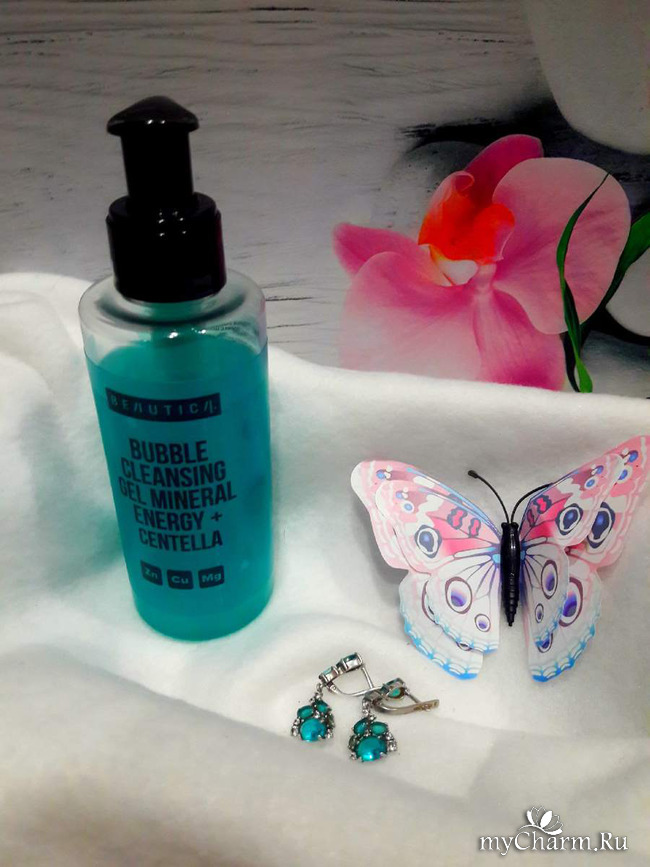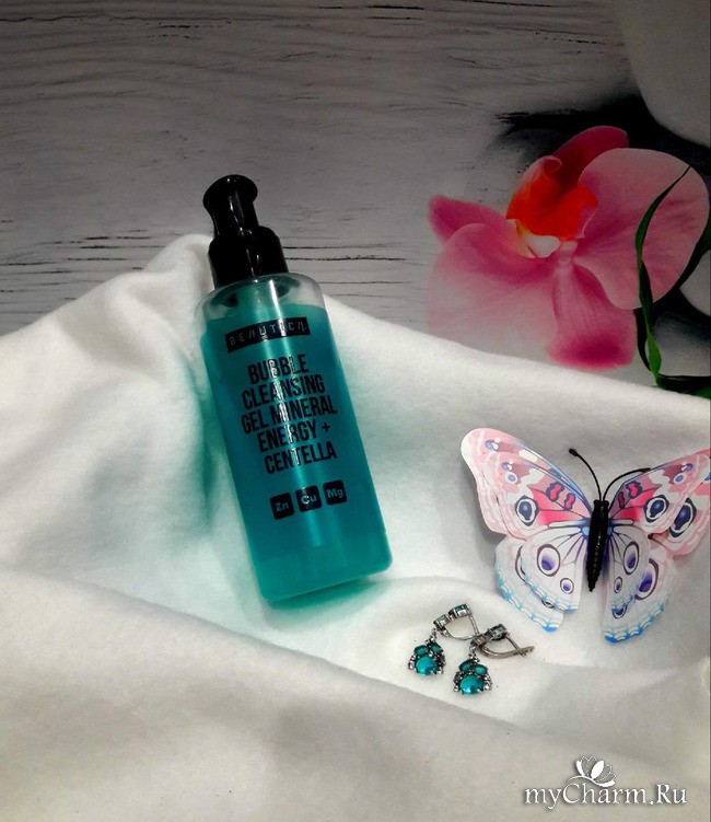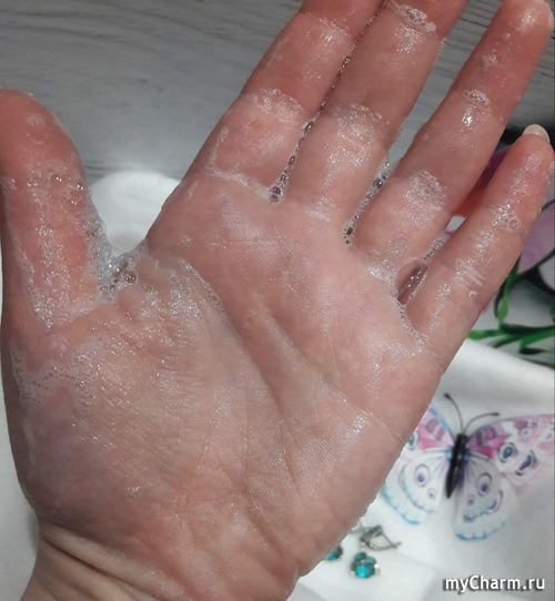 Пенообразование среднее, он не сильно пенится, но все же вспенивается, чувствуется очень легкая мыльность, которая обеспечивает скольжение по коже без сильного нажатия, тем самым не растягивает и не создает морщины.