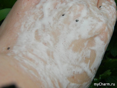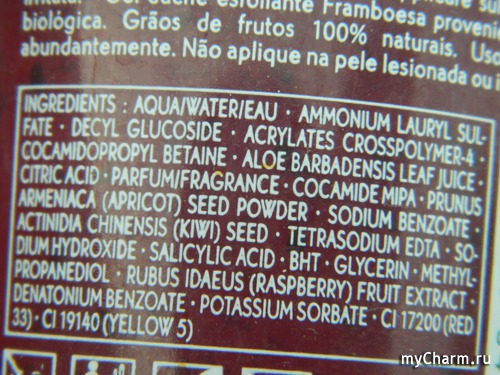 Пенится «Малина БИО» хорошо (почему бы и нет, если есть лаурилсульфат аммония?). Пена пышная и ароматная, прямо как облачко. Но вот отшелушивающие частицы в нём абсолютно не чувствуются. Совсем ни капельки! Я, конечно, понимаю, что это не скраб, но отшелушивать-то он должен!