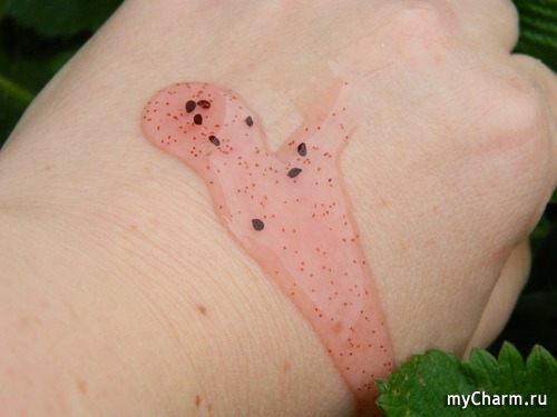Гель-гоммаж – это довольно жидкое гелеобразное средство розового цвета с ярко выраженным ароматом малины. В нём отчётливо видны семена киви и мелкие частицы, которые я сначала приняла за семена малины. Но потом, когда лучше рассмотрела, поняла, что это не они. По всей видимости, это либо пудра абрикосовых косточек, либо полиэтиленовые скрабящие частицы (они, кстати, тоже заявлены в составе). Самое первое впечатление – средство приятное