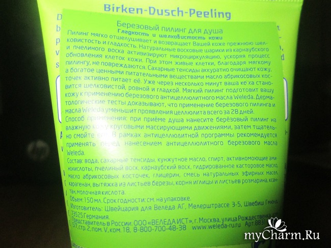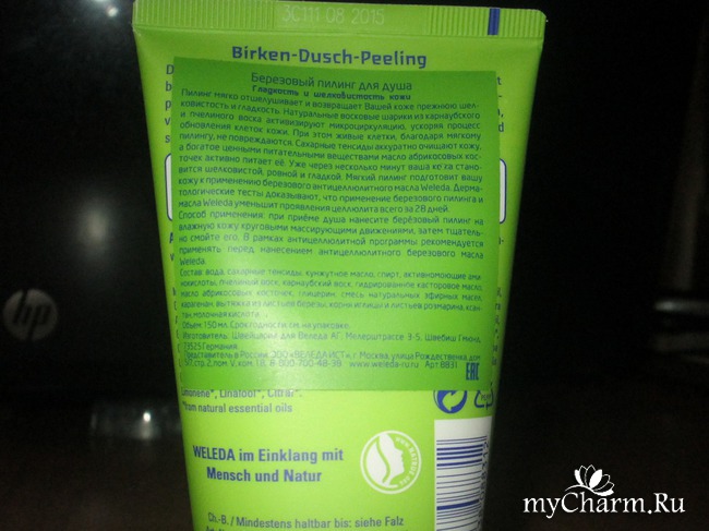 Туба 150 мл-овая. Ощущения от применения – самые наиприятнейшие. Но начну по порядку. Огромный плюс такого мягчайшего пилинга для тела, я считаю, в его особом аромате. Компания, производящая данную косметику, работает под девизом «В согласии с человеком и природой». Выпускает только натуральную косметику, на основе вытяжек из лекарственных растений, выращенных, между прочим, в собственном саду, протяженностью до 20 га. Потому аромат, ну очень, натуральный. За другие средства компании говорить не берусь. Но что касается именно данного продукта, то здесь аромат выше похвал. Смесь ароматов из отвара березовых листьев и лимона. Причем хорошо различается, что это именно аромат эфирных натуральных масел, а не химических ароматизаторов.