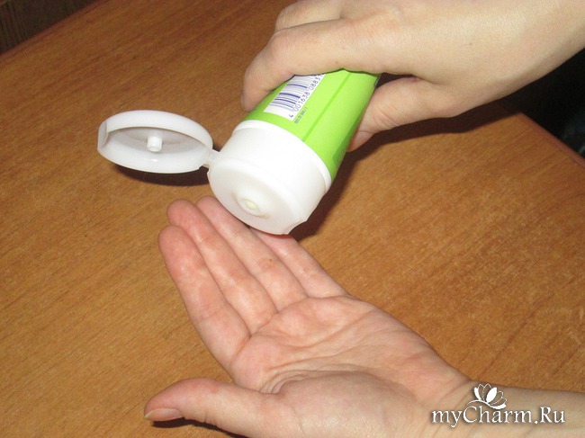 Нанесла средство на ладонь, попробовала потереть тело ладонью, но рукавицей со средством оказалось средство наносить куда эффективнее и удобнее.