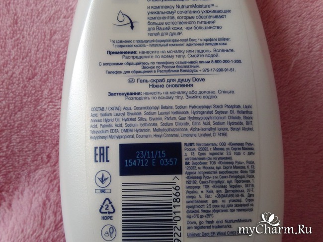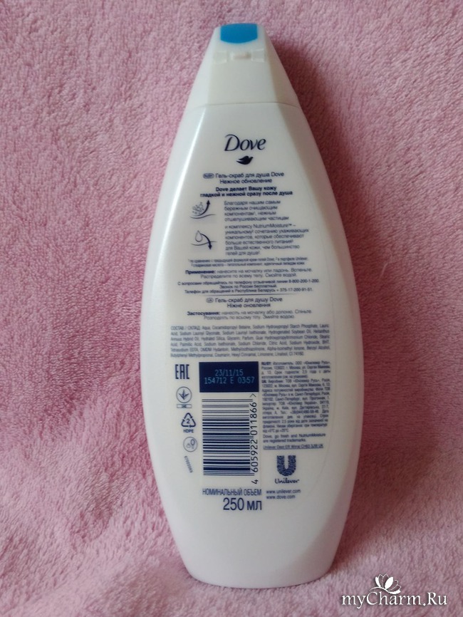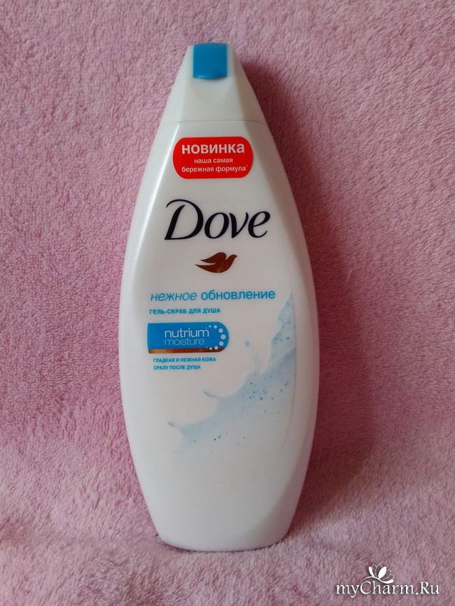 Надеюсь, не очень утомила Вас своими обзорами. ;) Сегодня хочу познакомить Вас с гелем-скрабом для душа DOVE «Нежное обновление», который был приобретен мной чисто ради финансовой выгоды. Средства данного производителя меня вполне устраивают, поэтому, увидев данный гель для душа с 50% скидкой, «схватила» всеми руками-ногами. Предыдущий собрат по ванной комнате к тому времени как раз заканчивался. Так гель объемом 250 мл обошелся мне всего за 75 рублей! Честно говоря, в каталоге обещали и другой гель, с миндальным молочком, и мне хотелось именно его… Но обстоятельства есть обстоятельства – купила такой.