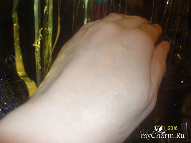 Открутив крышку флакона, выдавливаю гель. Первый раз нужно попробовать на небольшом участке кожи, чтобы посмотреть, нет ли у вас раздражения на средство. Наношу небольшое количество геля на руку, немного растираю кожу легкими массажными движениями - и сразу становится видным результат! Кусочков омертвевшей кожи образуется столько, как будто вы не мылись месяц!!! или два!!! хотя прямо перед этим я мыла руки с мылом два раза! Смыв все это, обнаруживаю, что кожа моей руки стала бархатной и гладкой, немного посветлела и увлажнилась, чего я, собственно, и ожидала. После первого эксперимента наношу гель-скраб уже на лицо, не боясь реакции кожи.