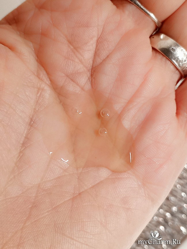 Сам гель по консистенции средней густоты, слегка желтоватого оттенка, с умопомрачительным ароматом. Чувствуется запах карамели. И да, наверное, все же жженной карамели, как и указано на флаконе. Обычно я не люблю сладкий ароматы, но этот мне пришелся по душе. Я от него прям кайфую.