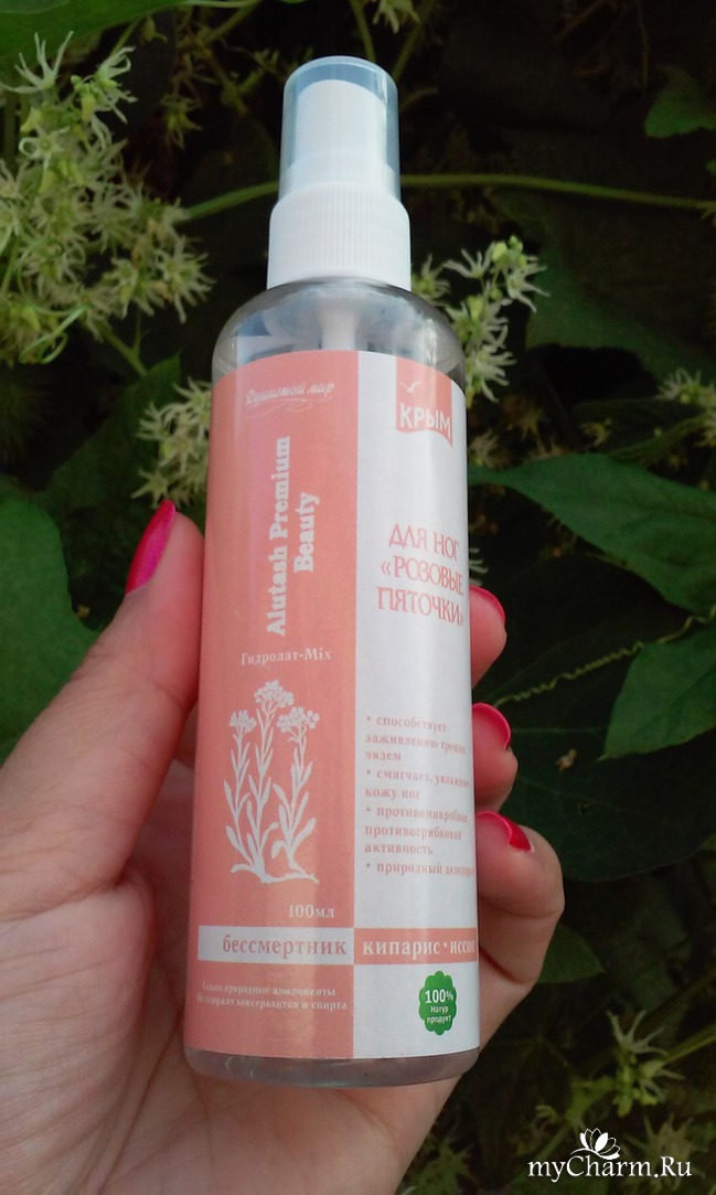Это чудо средство называется гидролат-микс "Розовые пяточки" для ухода за ногами. Выпускается под торговым брендом "Душистый мир" на Алуштинском эфиромасличном совхозе-заводе.